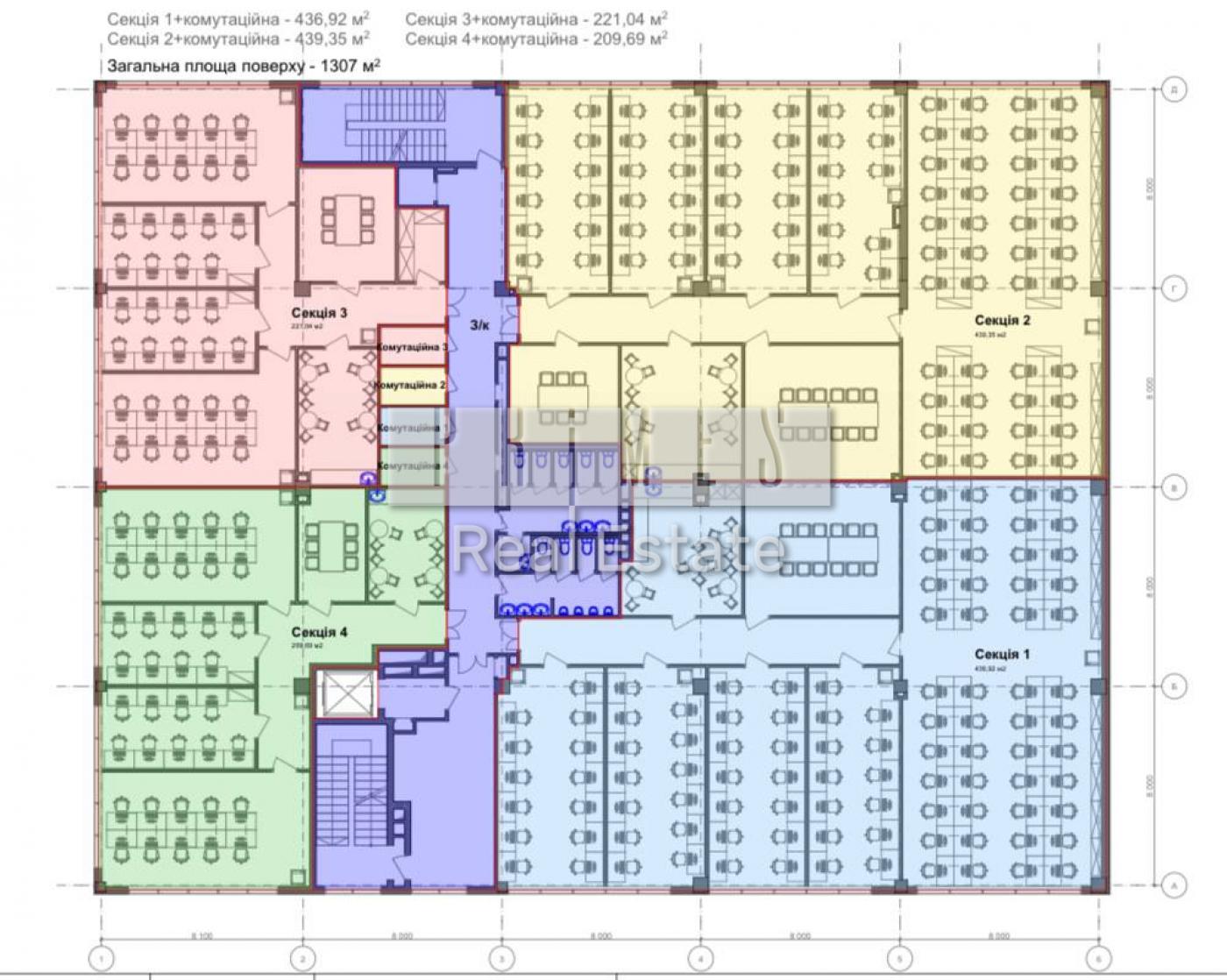 На поверсі 4 офіси (секції). У кожній секції своя кухня, с/у і серверна.